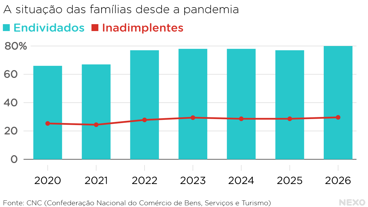 Também houve aumento no número de famílias inadimplentes – ou seja, aquelas com contas em atraso ou dívidas vencidas. De acordo com a CNC, elas eram 29,6% em março — pouco acima dos 28,6% no mesmo mês em 2025. Desse total de inadimplentes, 12,3% disseram não ter condições para quitar as dívidas em atraso.