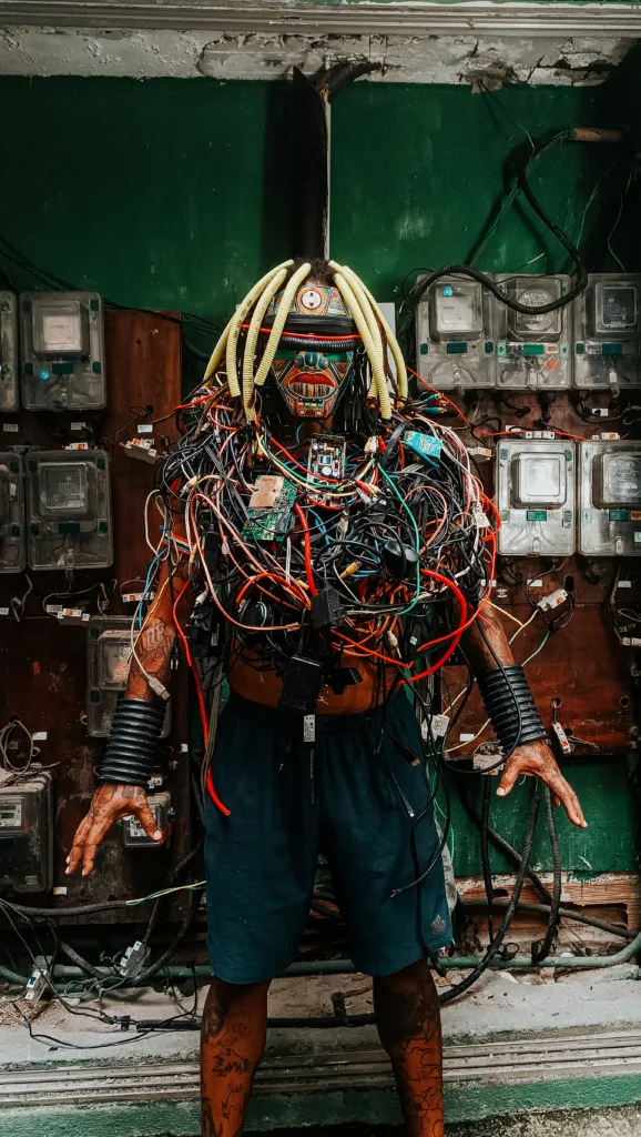 A estética visual de Cety Soledad é construída a partir da gambiarra. O emaranhado de fios soltos, os cabos e a fiação, tão presentes no cotidiano das favelas cariocas e na paisagem das periferias, se ramificam e se encontram em suas criações. “Sou artista por sorte. Onde eu moro, eu tropeço em talentos bizarros”, afirma o multiartista autodidata, que reconhece o território periférico como lugar de mentes criativas.