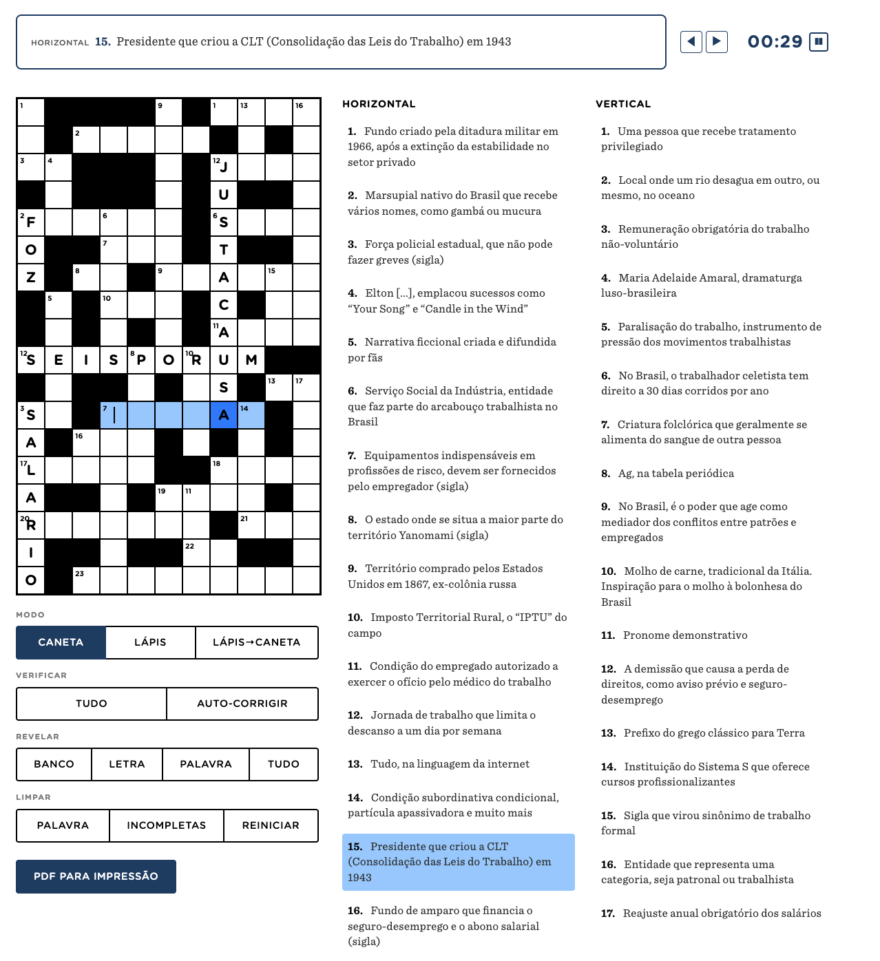 As palavras cruzadas do Nexo podem ser consideradas de nível difícil, mas incorporam recursos que tornam a experiência mais acessível. Há um banco com seis palavras que aparecem na grade e podem servir de pista, além de botões como “revelar palavra” e autocorreção.
