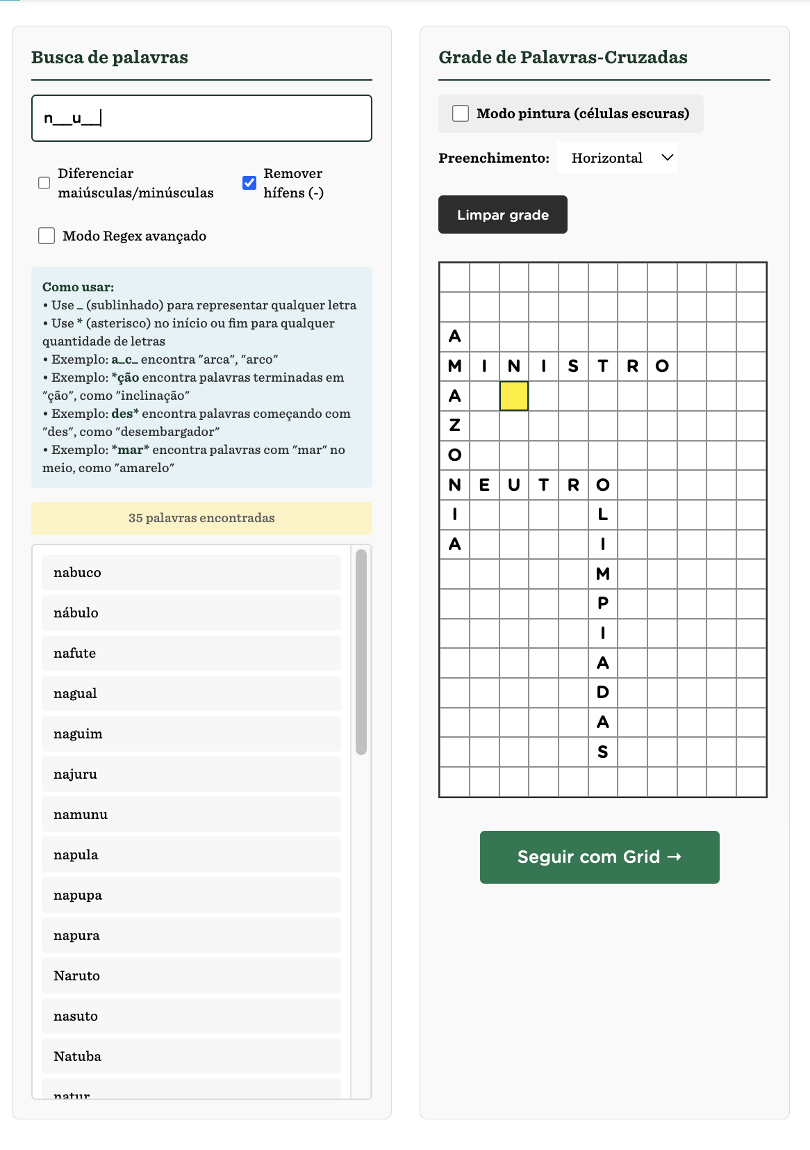 A grade da ferramenta interna funciona como um papel quadriculado. Ao lado, há um recurso para pesquisa das palavras sob demanda, que se encaixam exatamente no espaço disponível. Ao clicar em “seguir com grid”, aparece uma tela para completar as dicas e outras informações