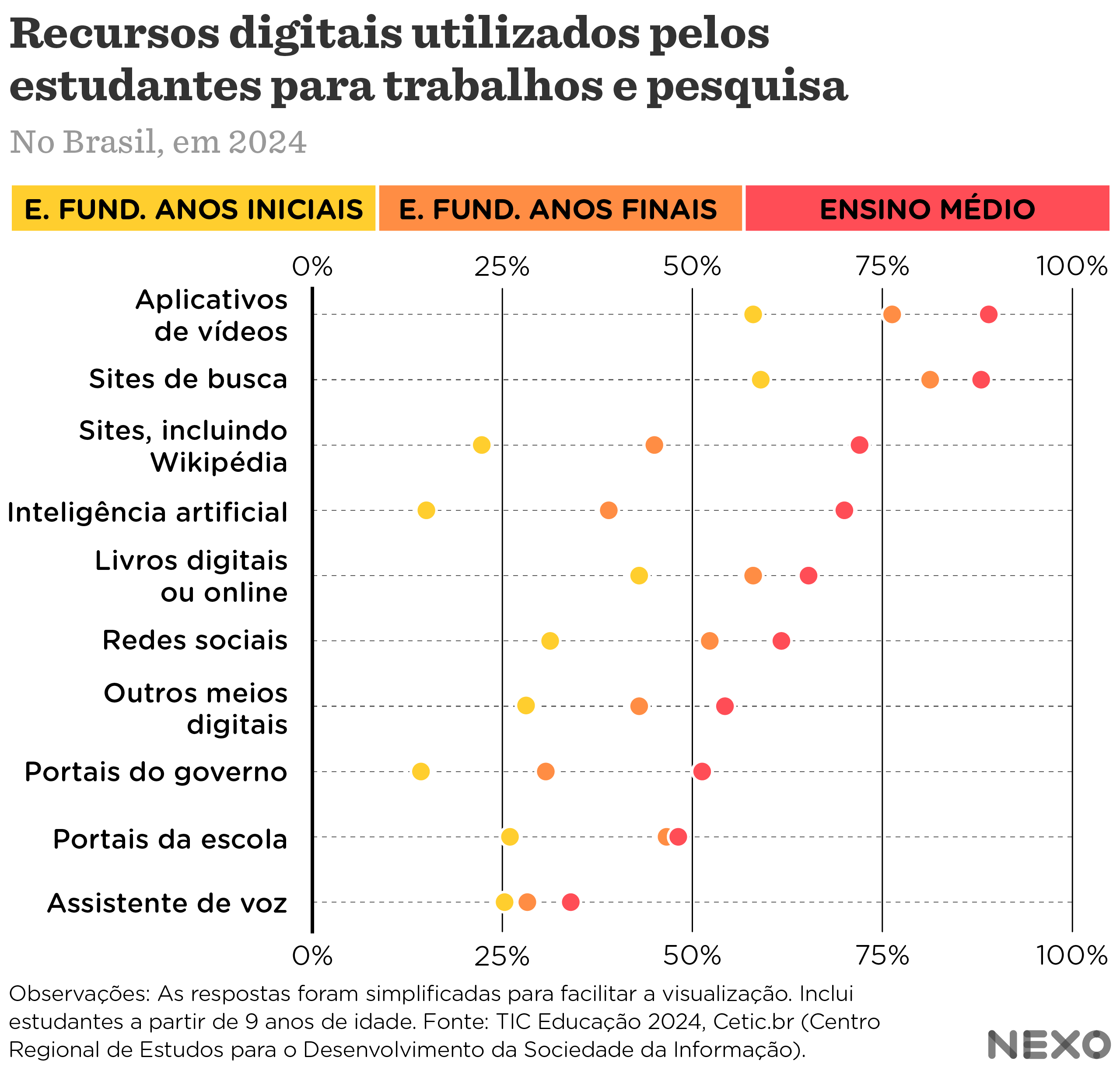 O número aumentava com a idade dos estudantes. Setenta por cento dos alunos do ensino médio utilizavam IA generativa, enquanto apenas 22% o faziam nos anos iniciais do fundamental (entre os que tinham mais de 9 anos).
