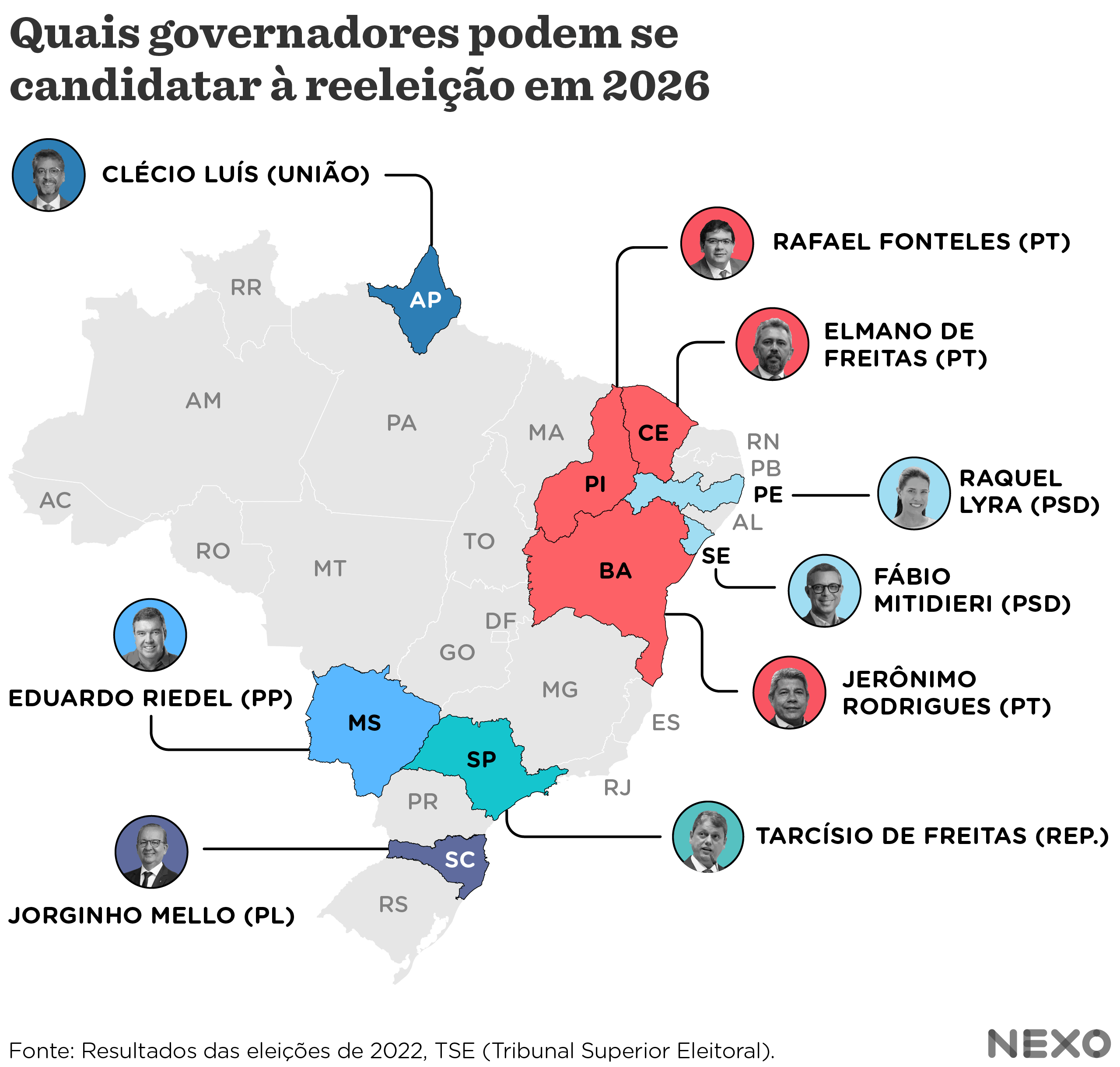 Cinco desses nove governadores são do Nordeste, três deles filiados ao PT. Outro nome que pode tentar um segundo mandato é Tarcísio de Freitas (Republicanos/SP), que tem reiterado a intenção de disputar a reeleição, descartando, ao menos por ora, a renúncia para concorrer à presidência da República.