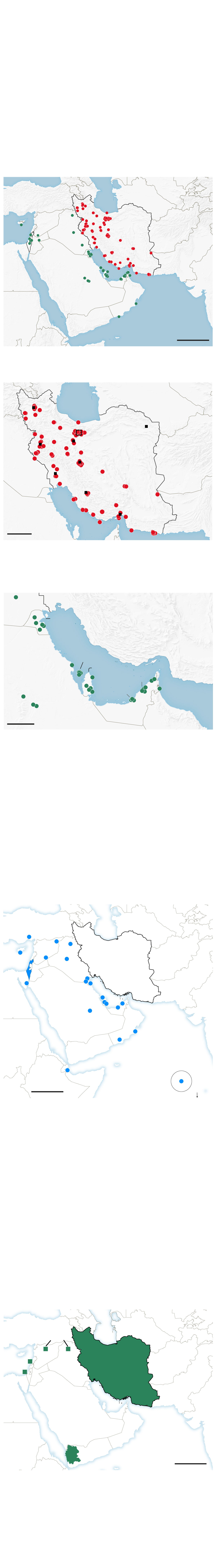 Todas as principais cidades, com exceção de Meshed, foram atacadas. Teerã é a capital, enquanto Qom é o principal centro religioso do país.