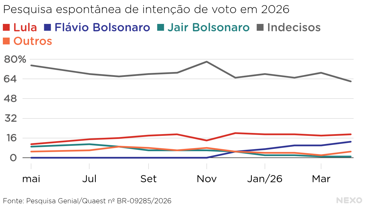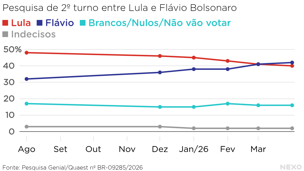 As pesquisas indicam um cenário acirrado. Levantamento divulgado em 15 de abril pela Quaest em parceria com a plataforma de investimentos Genial mostrou Flávio numericamente à frente de Lula pela primeira vez em um quadro de segundo turno do instituto: 42% a 40% em intenção de votos.